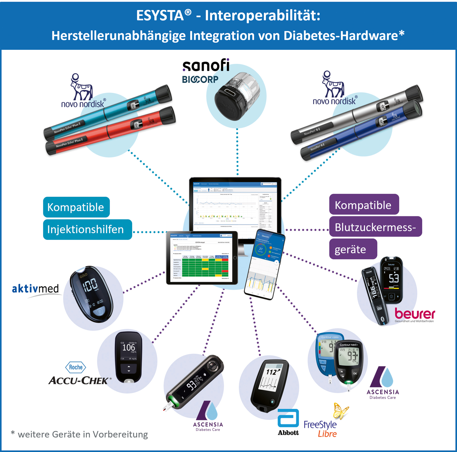 Eine zentrale Entwicklung des Unternehmens ist das ESYSTA-Produktsystem, das Insulineinheiten und Blutzuckermesswerte lückenlos speichert und automatisch in ein digitales Tagebuch überträgt. „Patienten haben über das ESYSTA-Portal und die dazugehörige App jederzeit Zugriff auf ihre Diabetes-Daten, und autorisiertes medizinisches Fachpersonal kann die Therapie basierend auf diesen Daten anpassen“, erläutert Dr. Horst Mertens. „ESYSTA erfasst als einzige Plattform weltweit sowohl Blutzucker- als auch Insulinwerte, was eine optimierte Steuerung der Therapie ermöglicht.“