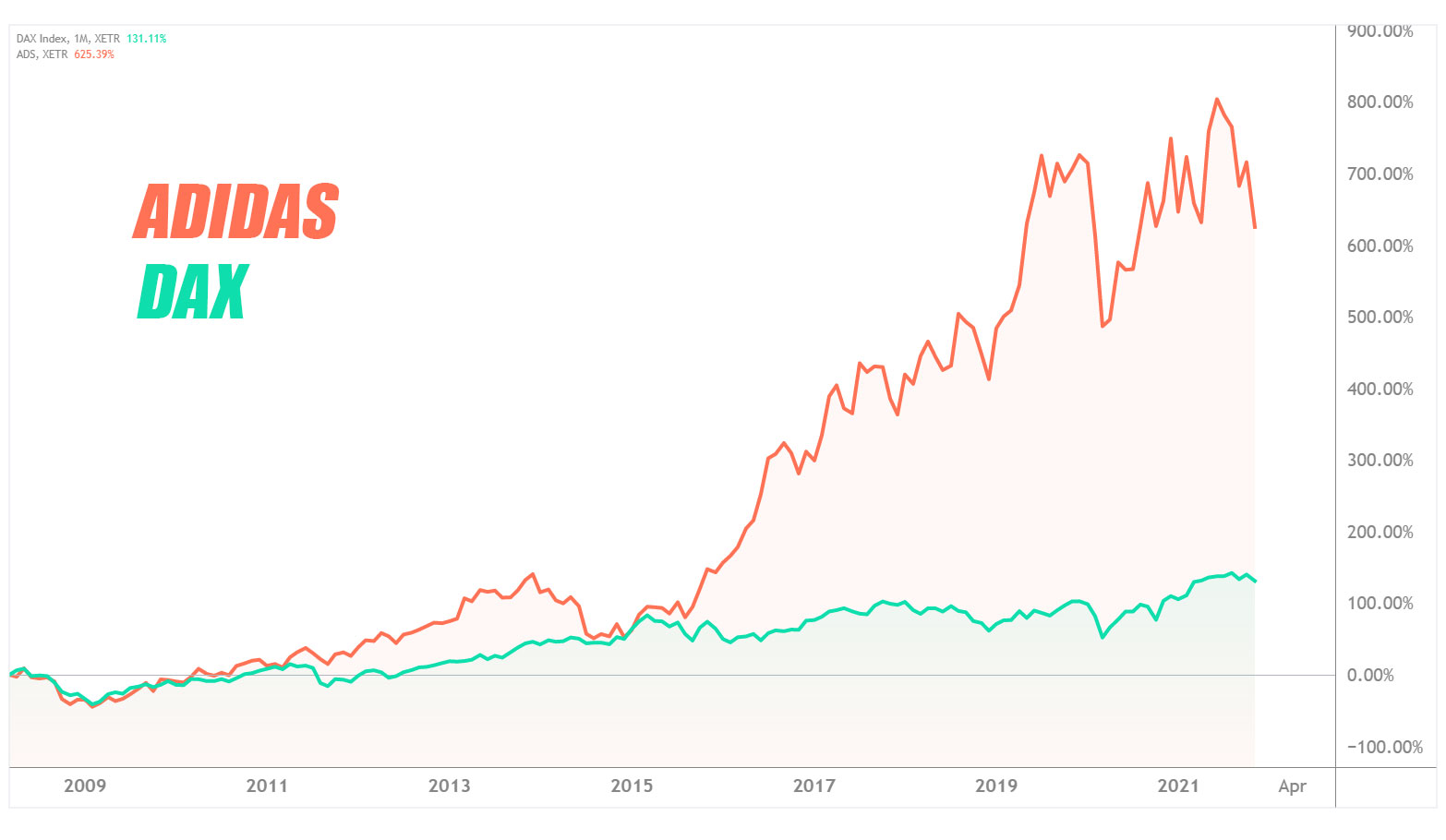 Die beiden folgenden Charts zeigen, welche Gewinne möglich sind, wenn Sie für Ihre Kapitalanlage auf die richtigen Aktien setzen. Unser erstes Beispiel zeigt die Wertentwicklung des DAX in den Jahren 2011 bis heute. Wenn Sie in diesem Zeitraum in ETFs auf DAX-Basis investiert hätten, könnten Sie sich heute zwar über Gewinne freuen - allerdings in eher moderatem Umfang. Eine langfristige Kapitalanlage in Aktien des Sportartikelherstellers Adidas hätte demgegenüber in dieser Zeit ein Plus von 719 Prozent gegenüber Ihrem ursprünglich eingesetzten Kapital erbracht.