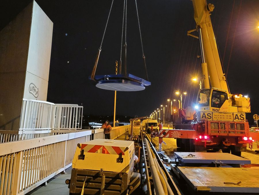 Carsten Schade: Unser größtes Projekt war die Sulzbachtalbrücke, die eine Gesamtlänge von 800 m hat. Das Projektvolumen betrug hier 20 Millionen EUR. Ein sehr herausforderndes Projekt war die Sanierung der Rheinbrücke Neuwied, deren Pfeiler auf einer kleinen Insel im Rhein stehen. Wir haben hier die Brückenlager getauscht. Ein Lager wiegt 13 t und hat einen Durchmesser von 2,6 m. Wir mussten ein aufwendiges Gerüst unter der Brücke montieren, damit die Lager mittels Kran auf das Gerüst unterhalb der Brücke gesetzt werden konnten. Die Lager sind dann manuell unter die Brücke und dann auf den Pfeiler verschoben worden. Dazu haben wir die gesamte Brücke vorher an einer Pfeilerachse mit 21 Pressen und einer Hubkraft von 17.000 t angehoben, sodass der Überbau auf den Pressen lag.
