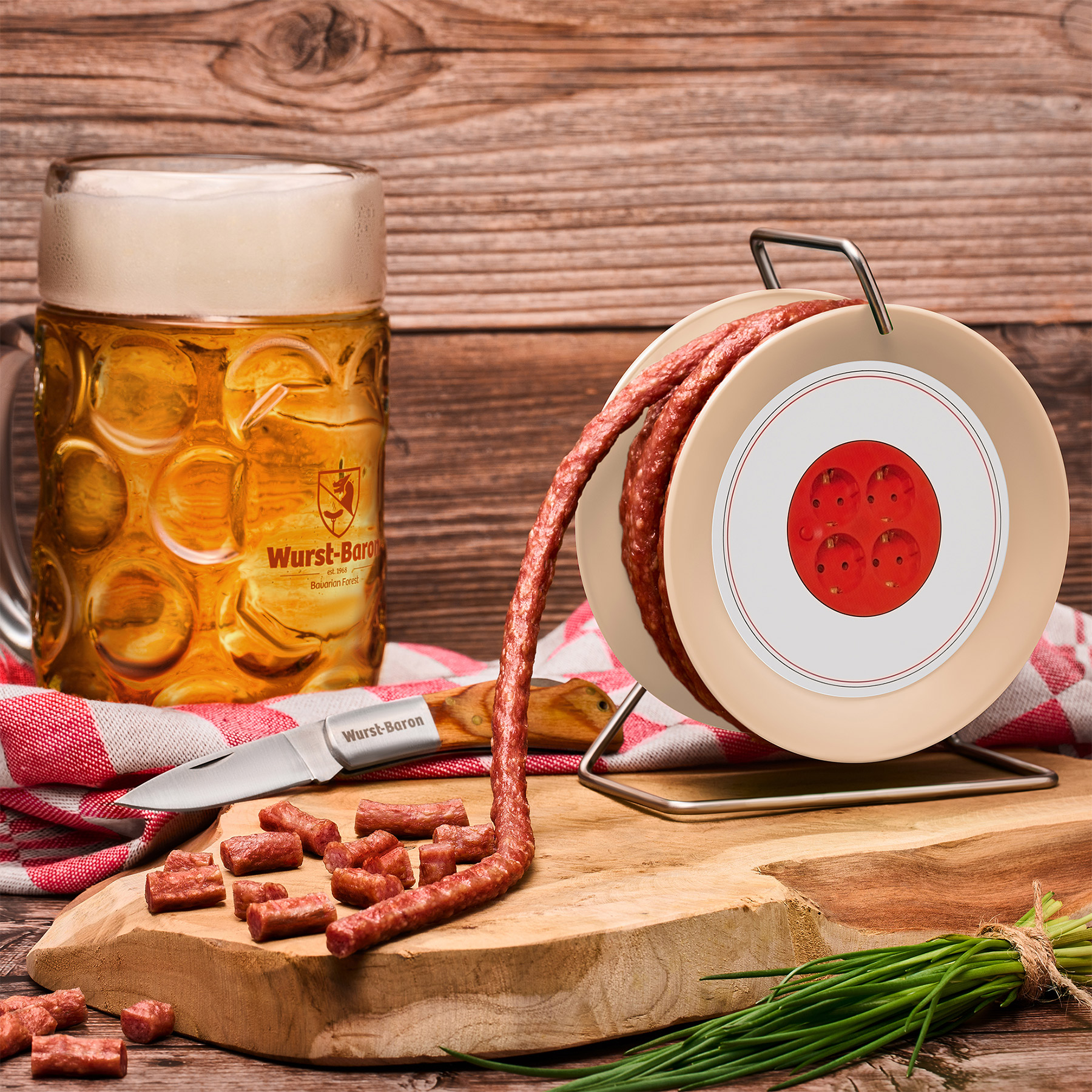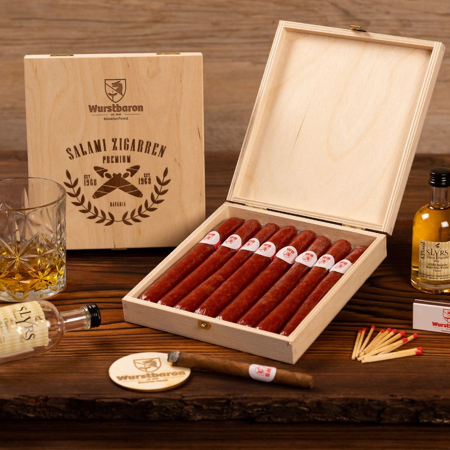 Andreas Breu: Neben dem Salamiherz gibt es mittlerweile auch eine Salami in Brezenform und als Stern sowie in vielen weiteren Spielarten – damit bestücken wir sogar einen eigenen Adventskalender. Wir freuen uns, wenn wir unsere Kunden dabei nicht nur geschmacklich überzeugen, sondern ihnen auch ein kleines Lächeln aufs Gesicht zaubern können, genauso wie etwa mit unserer Wurst in Zigarrenform oder mit unserem Salami-Lolli, der mit einem Holzspießchen versehen ist, um perfekt das Aussehen eines Lollis nachzuahmen. Unsere Wursttrommel – eine 3,50 m lange aufgerollte Wurst, die einer Kabeltrommel nachempfunden ist – ist inzwischen sogar in mehreren Fernsehkrimis aufgetaucht, ohne dass wir dazu von der Produktion eigens angefragt worden waren. Das zeigt, dass wir mit unseren Produkten regelmäßig einen Nerv treffen.