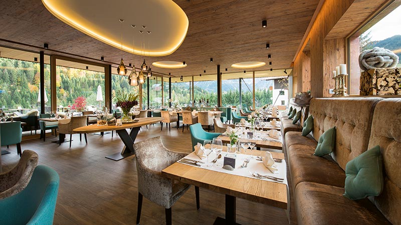 „Wir bezeichnen unseren Stil als Alpin-Chic: sehr modern und gemütlich“, betont der Geschäftsführer. „Es ist eine gute Mischung von älteren Elementen mit modernem Design. Unser Restaurant bietet klassisch alpenländische Küche. Aber hier spielen auch pflanzliche Produkte eine große Rolle. Dazu haben wir ein neues Konzept. Aktuell liegt unser Fokus auf Ernährung, Vitalität und Relaxing und es geht in Richtung Meditation und Yoga.“
