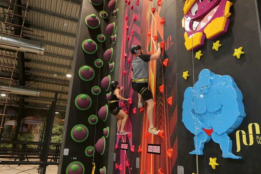 Robert Friedrich: Es gibt acht unterschiedliche Großattraktionen. Dazu gehört der Laser-Tech-Bereich über zwei Ebenen, eine 3-D-Schwarzlicht-Minigolfanlage, Kletterwände mit bis zu 10 m Höhe auf 16 verschiedenen Routen, ein großer Trampolinpark, ein Abenteuer-Labyrinth für bis zu 460 Personen gleichzeitig, Virtual Reality, ein Kleinkind-Bereich und ein sehr großer Gastronomiebereich mit einer eigenen Küche, die italienische Spezialitäten anbietet. Darüber hinaus ist FUNDORA mit anderen Attraktionen in unserer Region vernetzt. Wenn man im Sommer zum Beispiel ein FUNDORA-Ticket kauft, kann man die Einrichtungen am Filzteich mitnutzen, ein Strandbad mit Sprungtürmen bis 6 m Höhe, Rutschen, Beach-Soccer, Volleyball, und anderen Sportmöglichkeiten.