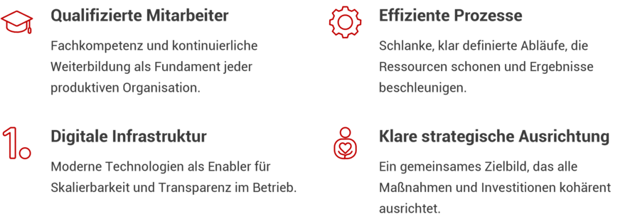 Um es deutlich zu betonen: In diesem Umfeld reicht es nicht mehr, hier Kosten zu senken oder dort einzelne Prozesse zu optimieren. Entscheidend wird die Frage, wie Produktivität ganzheitlich verstanden wird. Denn heute und noch viel mehr morgen entsteht Produktivität aus dem Zusammenspiel von: