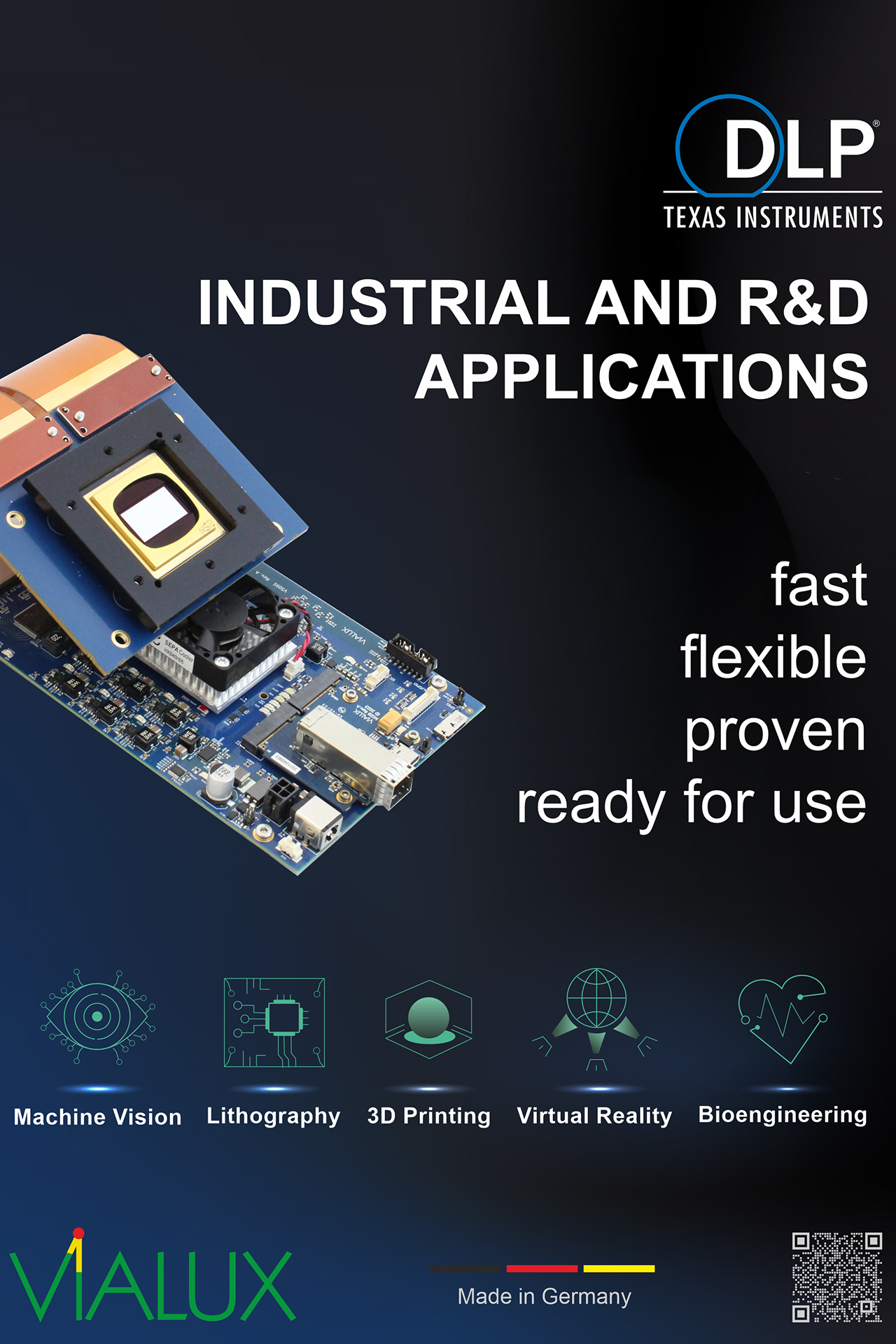 ViALUX ist ein mittelständisches Technologieunternehmen, das im Jahr 2000 von zwei Wissenschaftlern gegründet wurde und sich mit dem optischen Messsystem AutoGrid® und DLP® Subsystemen schnell einen Namen machte. „Das erste Produkt war AutoGrid®, ein Gerät zur Analyse von Blechbauteilen, das vor allem in der Automobilindustrie Anwendung findet“, erklärt Geschäftsführer Oliver Seifert. „Es handelt sich dabei um einen handgehaltenen Messkopf mit vier Kameras und entsprechender Software, mit der man zum Beispiel feststellen kann, ob an einem Blechbauteil die geforderte Mindestblechdicke unterschritten wird und somit technologische oder konstruktive Änderungen vorzunehmen sind.“ Parallel dazu stand immer die DLP® Technologie im Fokus. Seit 2002 ist ViALUX Design House Partner von Texas Instruments. „Basis unserer Produkte ist die DLP® Technologie, eine von Texas Instruments entwickelte Mikrospiegeltechnik mit einem elektronischen Bauelement als Herzstück, dem DMD-Chip (DMD = Digital Micromirror Device)“, sagt Oliver Seifert. „Mit dieser komplexen Technologie kann man strukturiertes Licht erzeugen, was sie für Anwendungen wie Projektoren oder Head-up-Displays im Auto interessant macht. Wir sind hier im Advanced Bereich tätig, für Top-Anwender, für die höchste Performances entscheidend sind.“